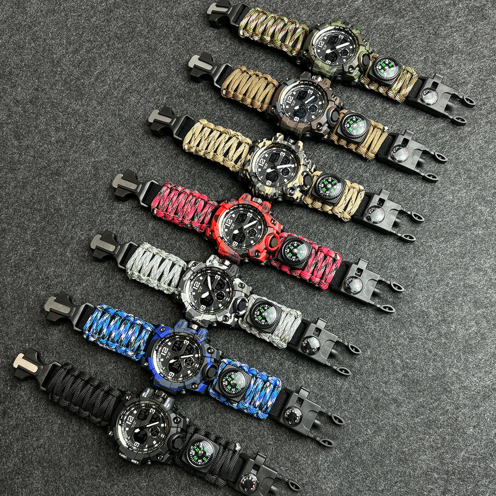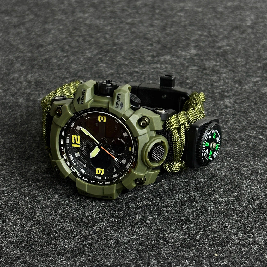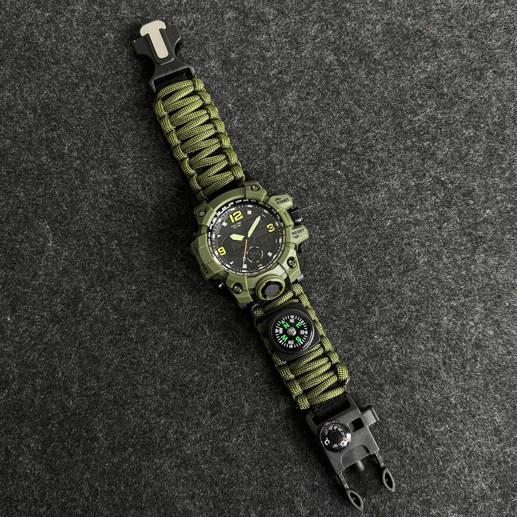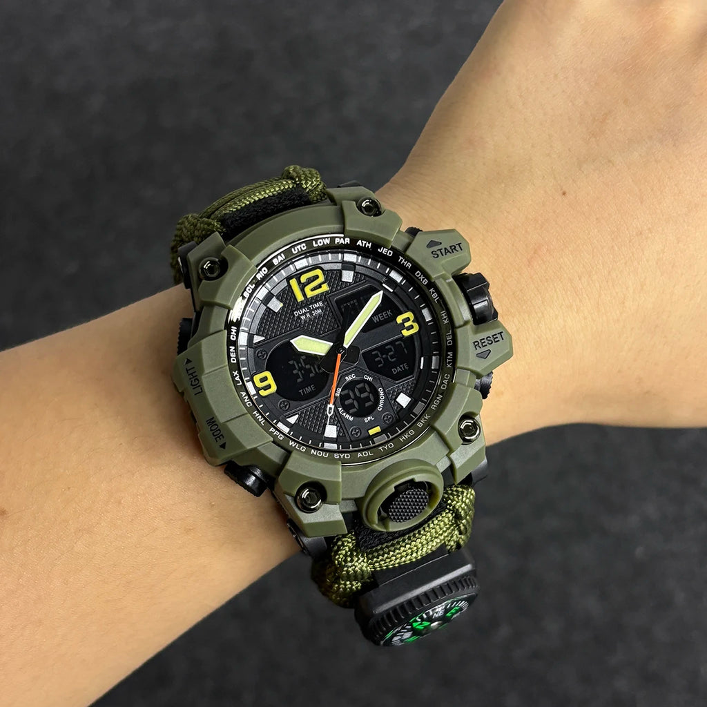 Relógio Militar de Sobrevivência ao Ar Livre Masculino Verde LED Digital Multifuncional à Prova d'Água com Duplo Visor
