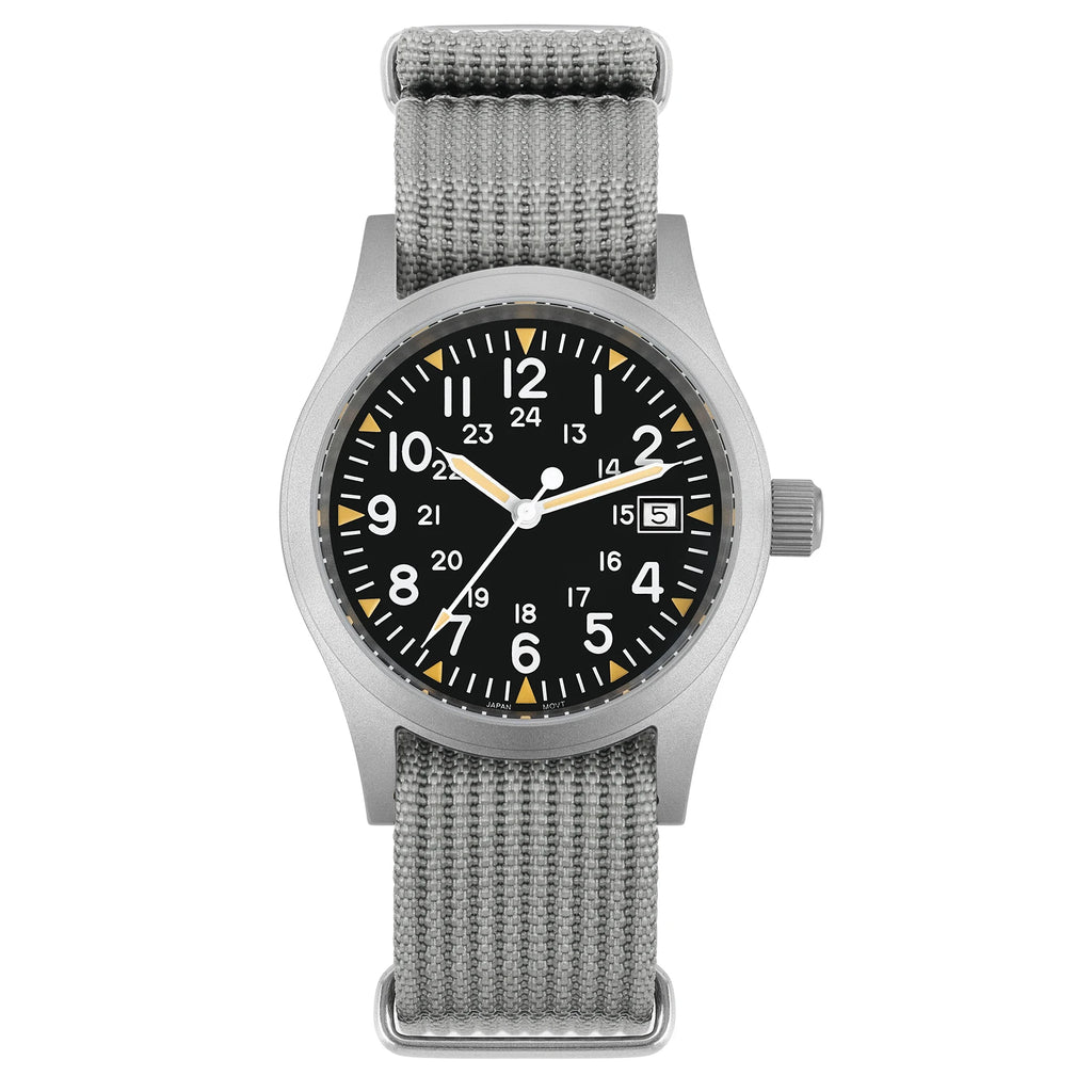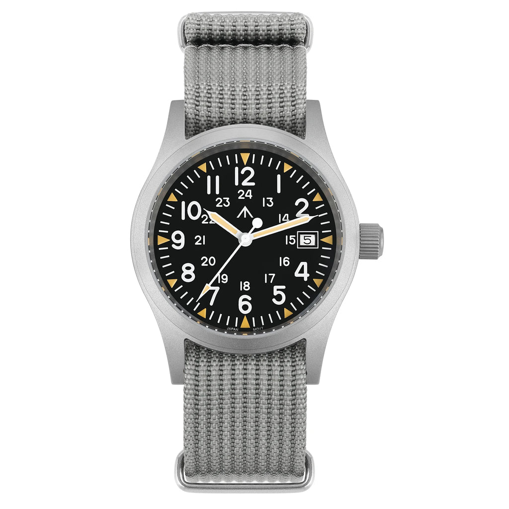 Relógio militar Militado ML05 com movimento de quartzo Ronda 515, cristal de safira abaulado com revestimento antirreflexo de alta transparência e luminescência, 38 mm, estilo vintage.