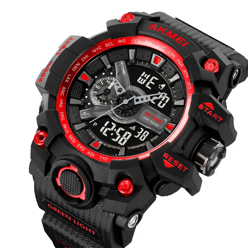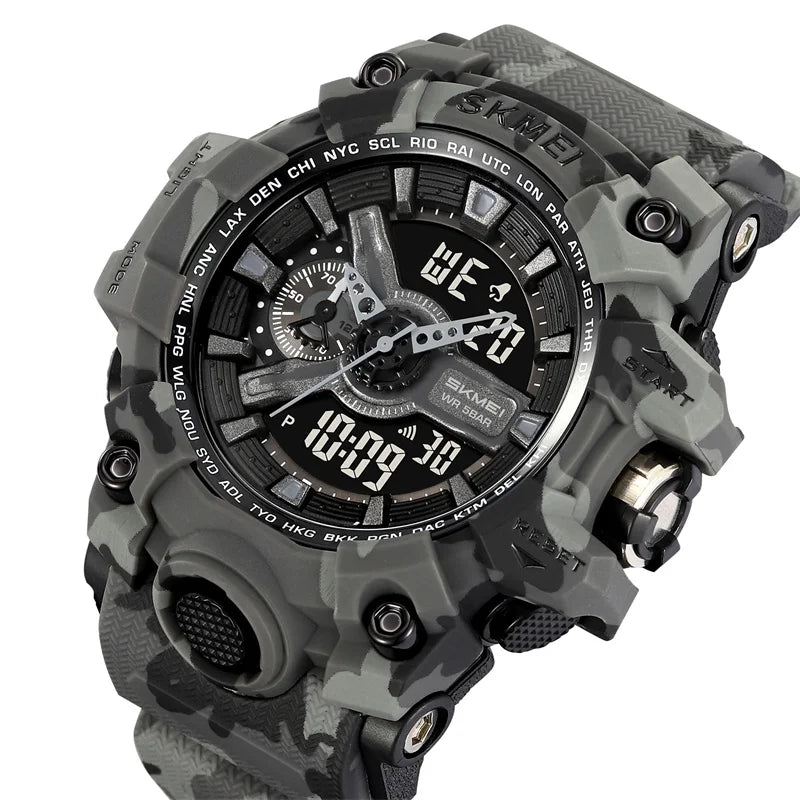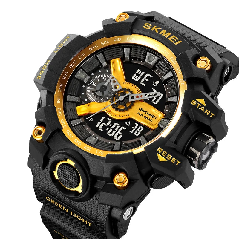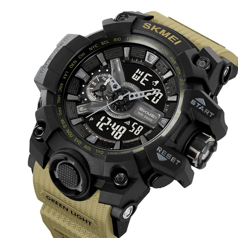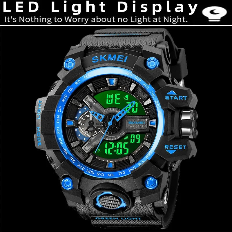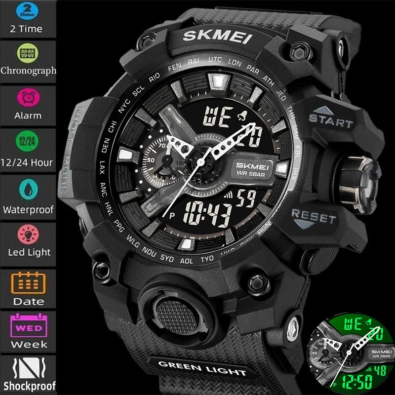 Relógio masculino esportivo militar à prova de choque Skmei com data, visor analógico-digital moderno, mostrador grande, LED, à prova d'água, alarme, fuso horário duplo Zona